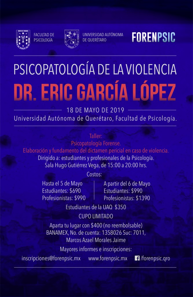 Forenpsic en convenio con la Facultad de Psicología de la Universidad Autónoma de Querétaro, llevaron a cabo el Taller: “Psicopatología Forense. Elaboración y fundamento del dictamen pericial en caso de violencia”. Impartido por el Dr. Eric García López.